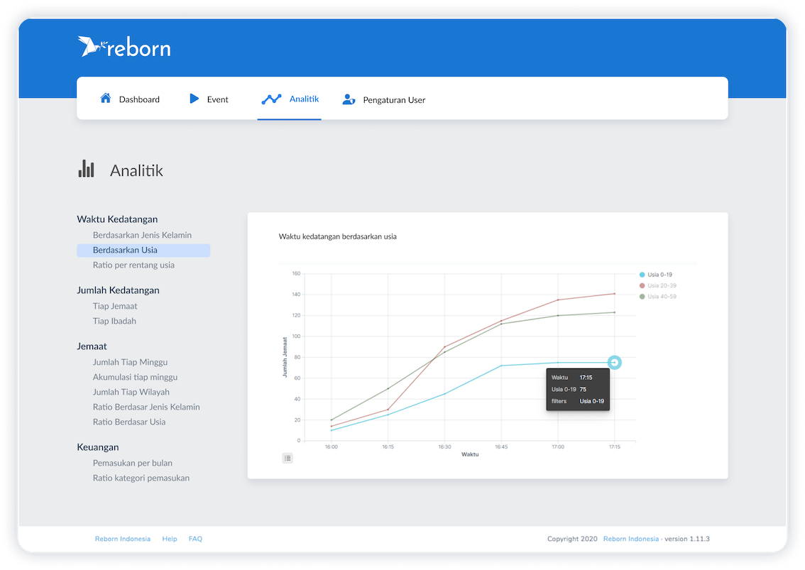 Reborn membantu Anda mengenali jemaat dan anggota komunitas lebih baik dengan analitik perilaku jemaat yang instan dan komprehensif. Setiap action yang Anda akan ambil, akan menjadi lebih terarah dan berorientasi. Dengan analitik Reborn, pertumbuhan komunitas rohani dan gereja menjadi lebih terukur.