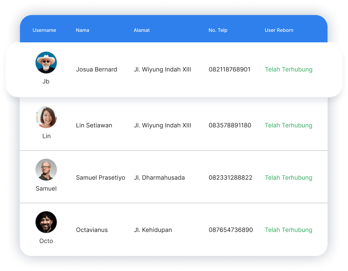 Reborn menyediakan fitur supaya gereja dapat melihat data jemaat, komunitas dan gereja cabang. Sehingga anda dapat lebih fokus untuk membangun dan meningkatkan pelayanan