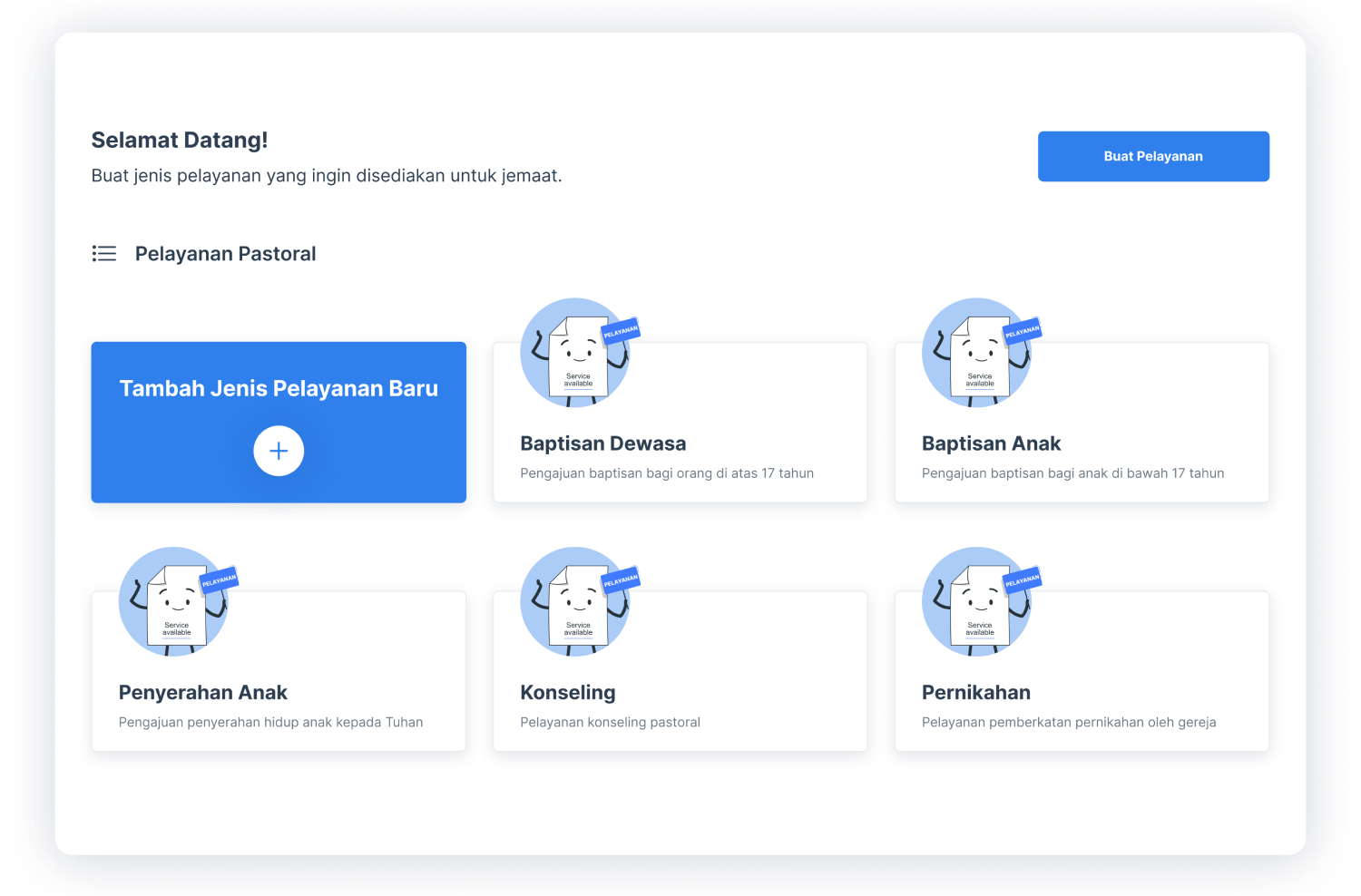 Buat berbagai jenis layanan administrasi gereja yang memudahkan jemaat untuk mendapatkan pelayanan